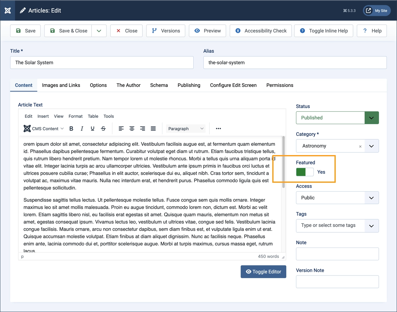 Any article can be designated as a featured article. In this tutorial we'll create a simple article, but you may use an existing article instead.
