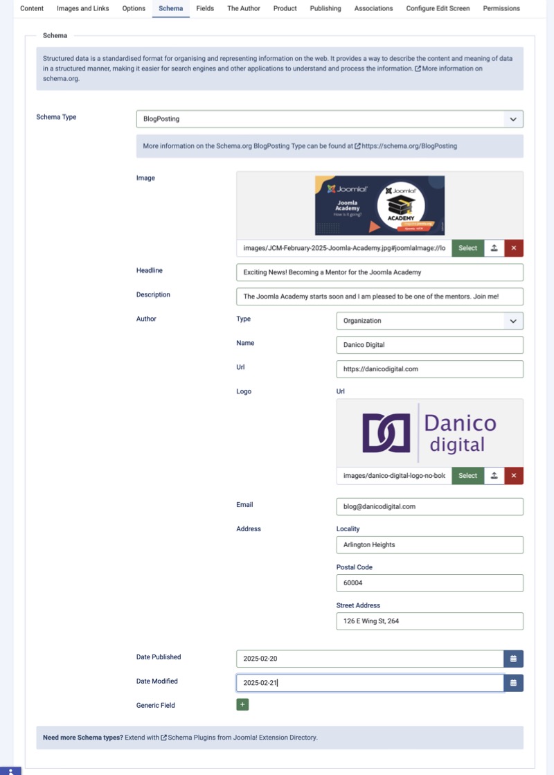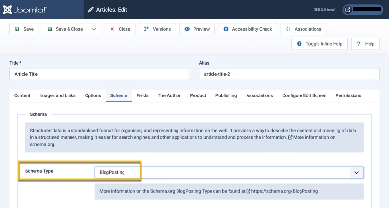Accessing the Schema.org Custom Fields provides instructions on how to access the schema.org custom fields within the Article Manager. After selecting the Schema Type, the appropriate fields will display based on the properties defined for the Schema Type on schema.org.