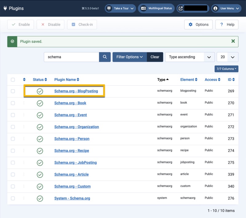 If you do not see BlogPosting in the list, the plugin is not active. Go to System > Plugins, search for Schema and tap the checkbox to activate the plugin. It should show a green checkmark like in the screenshot below.